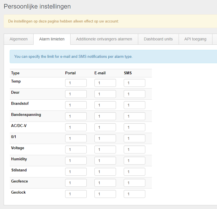 Voor deze instelling gaan we naar een andere locatie in de Webportal. In het menu onder ‘Persoonlijke instellingen’ op het tabblad ‘Alarm limieten’ kunt u het maximumaantal notificaties per alarm instellen. De standaardwaarde voor een limiet is ‘1‘, deze waarde kan hier verhoogd worden.