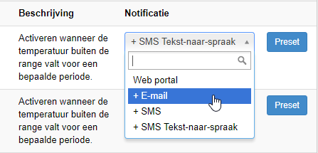 In de kolom Notificatie stelt u in waar u de notificatie wenst te krijgen. Op de Webportal krijgt u de notificatie standaard, daarbovenop kunt u kiezen voor +e-mail, +SMS en +SMS tekst naar spraak. Het + PLUS teken verteld u dat elke gekozen optie bovenop voorgaande komt.