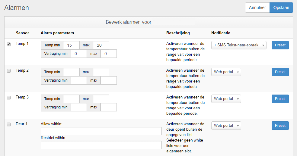 Temperatuur sensoren: U stelt de minimale en maximale temperatuur waarde in en krijgt bij overschrijding een alarm in de Webportal, per mail, per SMS én per SMS tekst naar spraak.