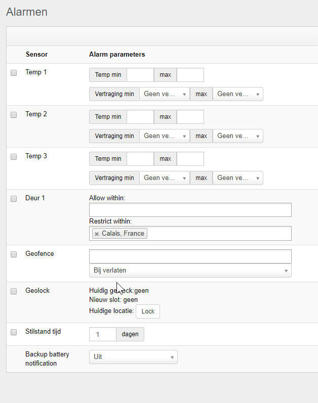 Om de temperatuurwaarde te bewaken kunt u een alarm instellen op de gewenste waarden. Het spreekt voor zich dat u de laagste en de hoogste temperatuurwaarden in Celsius in kunt geven. Onder de temperatuurwaarden kunt u aangeven wat de vertragingstijd moet zijn. Hiermee kunt u tijdens het laden en lossen overbodige notificaties voor het overschrijden van de bovengrens voorkomen. Wanneer u bijvoorbeeld 30 minuten instelt zal de notificatie pas verzonden worden als de bovengrens langer dan 30 minuten overschreden wordt.