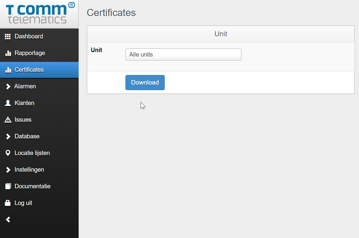 Op de pagina ‘Certificaten’ kunt u één of alle voertuig(en) uitkiezen om vervolgens de temperatuur certificaten per voertuig in een ZIP-bestand te downloaden. In dit ZIP-bestand zijn de certificaten in PDF-formaat opgenomen.