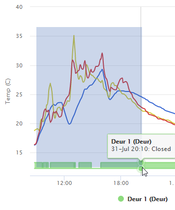 Op het tabblad ‘Temp/Deur’ worden de temperatuurwaarden van de geselecteerde unit weergegeven in een grafiek, eventueel aangevuld met de deurstatus. Je kunt op deze grafiek een selectie maken om verder in te zoomen en de informatie meer in detail te bestuderen.