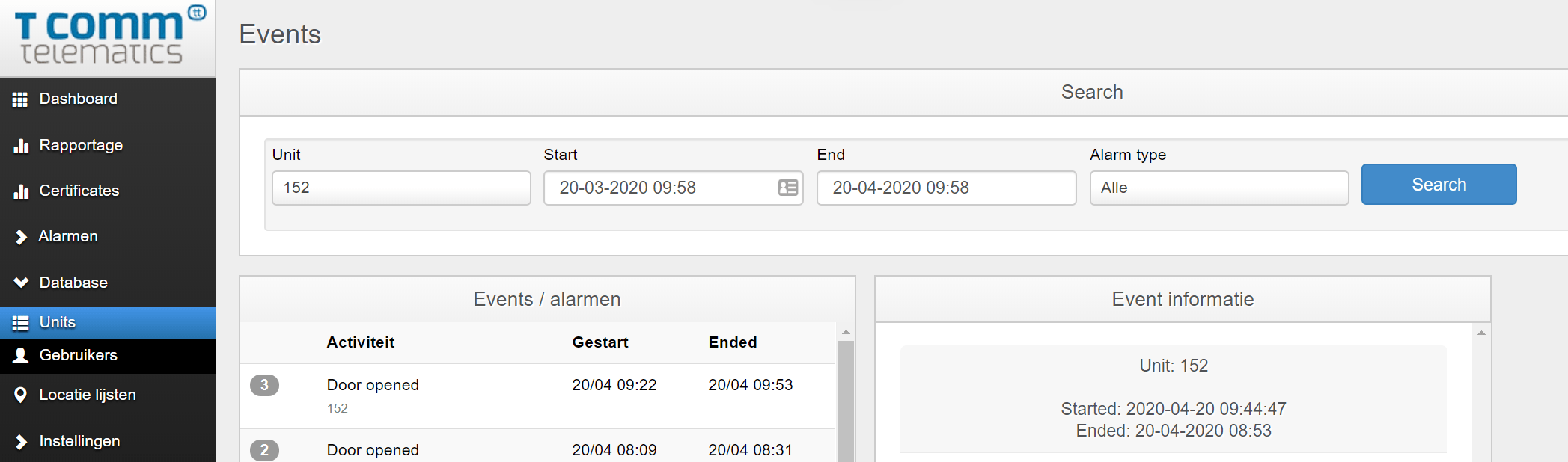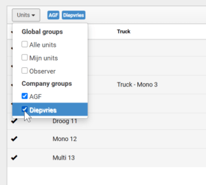 Op het dashboard in het selectie vak van groepen wordt bij iedereen standaard ‘Alle units’, ‘Mijn units’ en ‘Observer units’ getoond. Alle units zijn alle actieve voertuigen die met T Comm Telematics hardware uitgerust zijn. Mijn units is een persoonlijke selectie in tegenstelling tot andere groepen die alleen aan jouw getoond worden. Onder ‘Observer units’ zie je de voertuigen van andere bedrijven die met je gedeeld worden. Als laatste heb je de bedrijfsgroepen die door jou en je collega’s aangemaakt worden. Het aantal groepen wat je aan kan maken is onbeperkt.