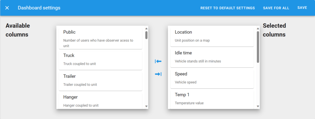 Om kolommen te de-selecteren voor het dashboard voer je de handelingen omgekeerd uit. Verplaats de kolommen van rechts naar links.