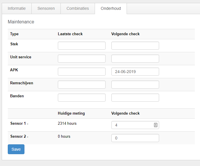Voertuig onderhoudsmomenten kunnen geregistreerd worden in de Database > Units > Voertuig. De APK datum wordt automatisch eenmaal per vierentwintig uur aangevuld door een koppeling met het RDW.
