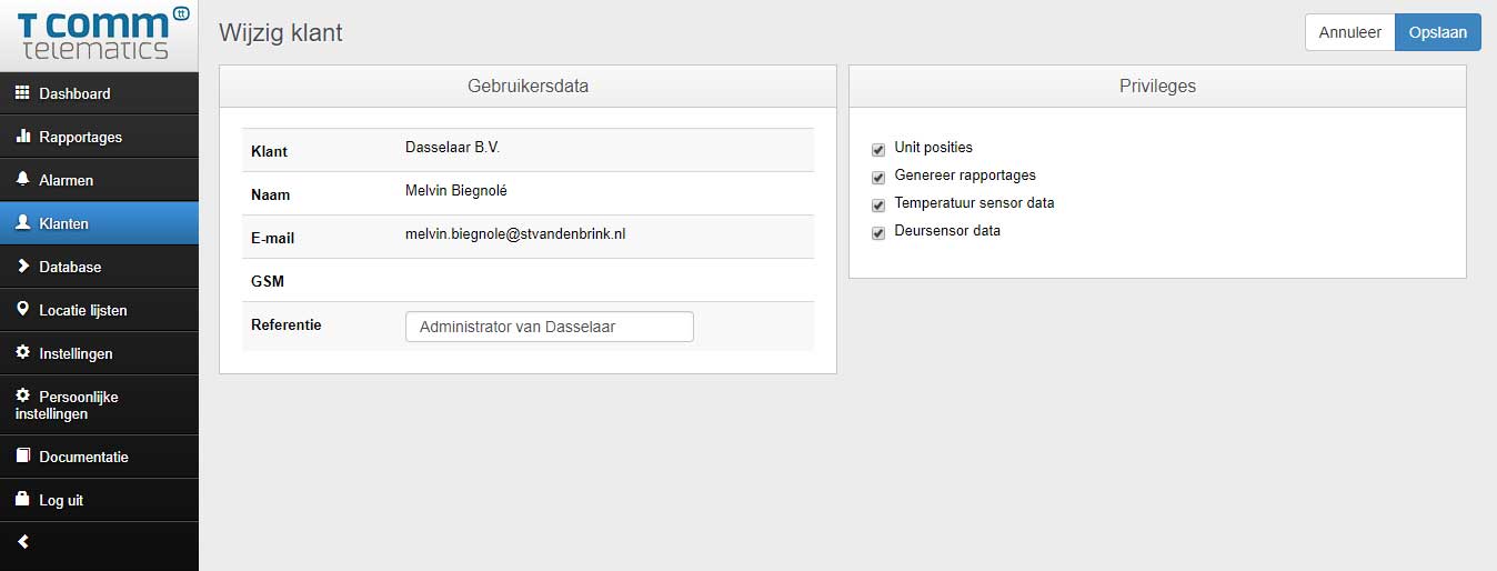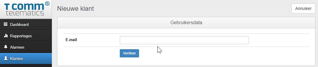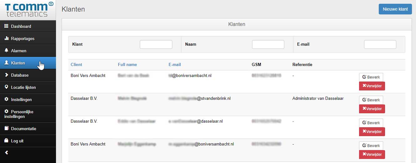 Het menu onderdeel ‘Klanten’ is alleen inzichtelijk en te beheren door de bedrijf administrator van de T Comm Telematics Webportal. De bedrijf administrator kan hier voor een klant een account aanmaken zodat deze toegang tot de Webportal krijgt en vanaf dat moment inzicht in de gegevens heeft. Door inzicht te geven levert u optimaal service en bespaart u zichzelf werktijd voor het genereren van rapporten. Tussentijdse verzoeken voor statussen zijn voortaan verleden tijd.