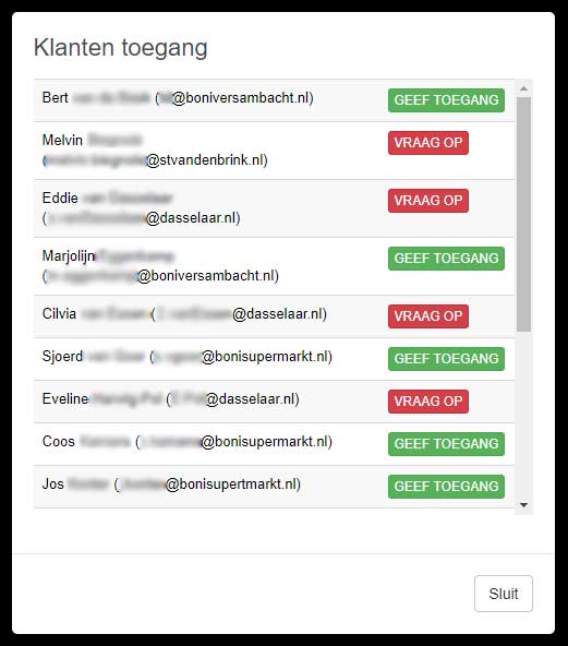 Bovenaan de klantenpagina kunt u zoeken op klant, naam en mailadres. Achter de klant kunt u kiezen voor bewerken of verwijderen.