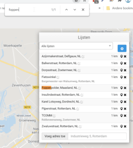 - Adressen aanpassen kunt u doen door gebruik te maken van de zoek functie van uw computer. Wanneer u de locatielijst ziet drukt u de volgende toetsen op uw toetsenbord: CTRL+F. Er verschijnt een zoekvenster rechtsboven waarin u de zoekterm typt en in de locatielijst wordt de overeenkomst getoond (zie screenshot).