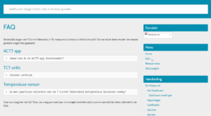 Aan de rechterzijde in het menu op de ‘Documentatie’ pagina hebben we een FAQ toegevoegd. De FAQ wordt constant bijgewerkt en zal daardoor qua inhoud groeien. Heeft u aanvullende vragen voor in de FAQ dan kunt u deze mailen naar m.vroon@tcommtelematics.com, vermeld in het onderwerp ‘FAQ’.